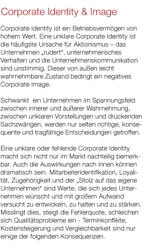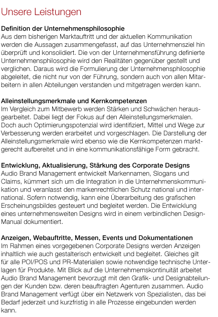 Definition der Unternehmensphilosophie Alleinstellungsmerkmale und Kernkompetenzen Entwicklung, Aktualisierung, Stärkung des Corporate Designs Anzeigen, Webauftritte, Messen, Events und Dokumentationen